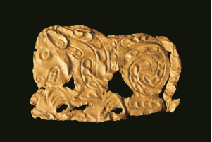 【虎噬羊紋金飾片·戰(zhàn)國·清水縣劉坪出土】工藝技法采用常見的錘碟法,在薄的金片的背面鏨刻虎形,正面隆起,邊緣剪切,四角有釘孔。虎呈蹲踞形,眼、鼻、耳、嘴、齒、爪都十分清晰,虎張嘴,伸溝狀前爪抓住一羊。