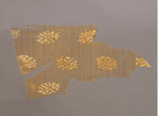 【粧金紗·元代·漳縣汪世顯家族墓出土】該墓葬中同時(shí)出土了許多元代的高級(jí)絲織品。此件粧金紗就是其中高級(jí)緞紋織物的一種。如棕色團(tuán)花粧金緞、粧金或銀天馬紋緞、粧銀簇花文緞等等。它不僅是罕見的早期緞物標(biāo)本,而且花色品種很多,非常珍貴。