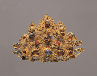 【鑲寶石金帽飾·明代·蘭州出土】帽飾分兩層,底層以極細(xì)的金絲盤繞成繁密的渦狀卷草紋;上層中間的金片鏨刻出如意云紋,兩側(cè)各有一金鳳,帽飾上鑲綴各種寶石。