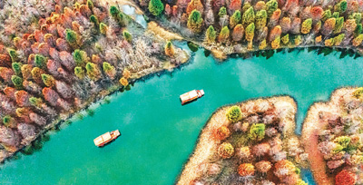 近年來(lái),江蘇省宿遷市宿豫區(qū)大力發(fā)展“農(nóng)旅+產(chǎn)業(yè)+文化”鄉(xiāng)村旅游,圖為宿豫區(qū)新莊彬荷園濕地里,五彩斑斕、錯(cuò)落有致的紅杉樹(shù)與清澈碧綠的河水相互映襯,猶如一幅色彩艷麗的“杉”水畫(huà)。陳紅 攝(人民圖片)