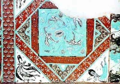 在莫高窟420窟中,還有一幅展現(xiàn)隋代游泳活動的畫面。圖中兩位游泳者正在模仿爬行的動作,呈兩腿交替打水、兩臂輪流劃水狀,頭部均轉(zhuǎn)向一側(cè)吸氣,類似現(xiàn)在自由泳中的基本動作和吸氣方式。