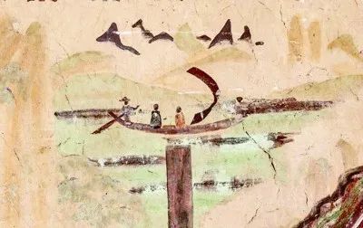 同樣是水上活動的操舟,在敦煌壁畫中也有多種表現(xiàn)。無論是舟的形制,還是操舟者的運行方式,都極為形象地展現(xiàn)在壁畫中。在時代為北周的莫高窟296窟中,有一艘正在水中航行,船體較短的獨木舟,尖頭尖尾,中間大、兩頭小。獨木舟中間乘坐三人,船頭船尾各有一名赤膊強健的水手在搖櫓與撐篙。這一畫面體現(xiàn)了人們于水中蕩舟的活動場景。而在時代為初唐的莫高窟323窟中,壁畫中展現(xiàn)的操舟形象卻是另一番場景,畫面中的船雖然仍是一葉扁舟,但舟身上部設(shè)置了風(fēng)帆,用于劃船的櫓也很清晰,類似今天的搖櫓帆船。舟行水中,風(fēng)帆鼓浪,前有一人撐槳,整體呈現(xiàn)出一幅“風(fēng)帆欲起橫江上,水影遙看海上天”的運動場景(圖①)。