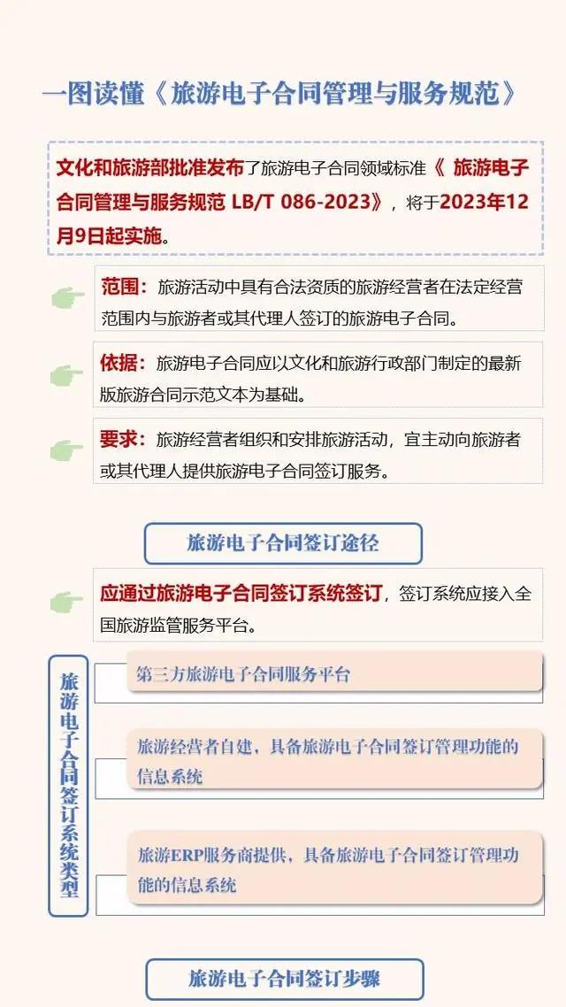 日前,文化和旅游部批準(zhǔn)發(fā)布了旅游電子合同領(lǐng)域的行業(yè)標(biāo)準(zhǔn)《旅游電子合同管理與服務(wù)規(guī)范》(以下簡稱“標(biāo)準(zhǔn)”),將于2023年12月9日起實施。文化和旅游部正式發(fā)布該規(guī)范的解讀。