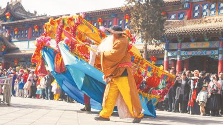 安定現(xiàn)龍山秧歌會(huì)在玉湖公園舞龍。  牛小棟 攝