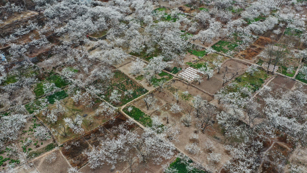 這是3月9日在隴南市武都區(qū)城關鎮(zhèn)石家莊村拍攝的櫻桃花(無人機照片)。 新華社記者 陳斌 攝