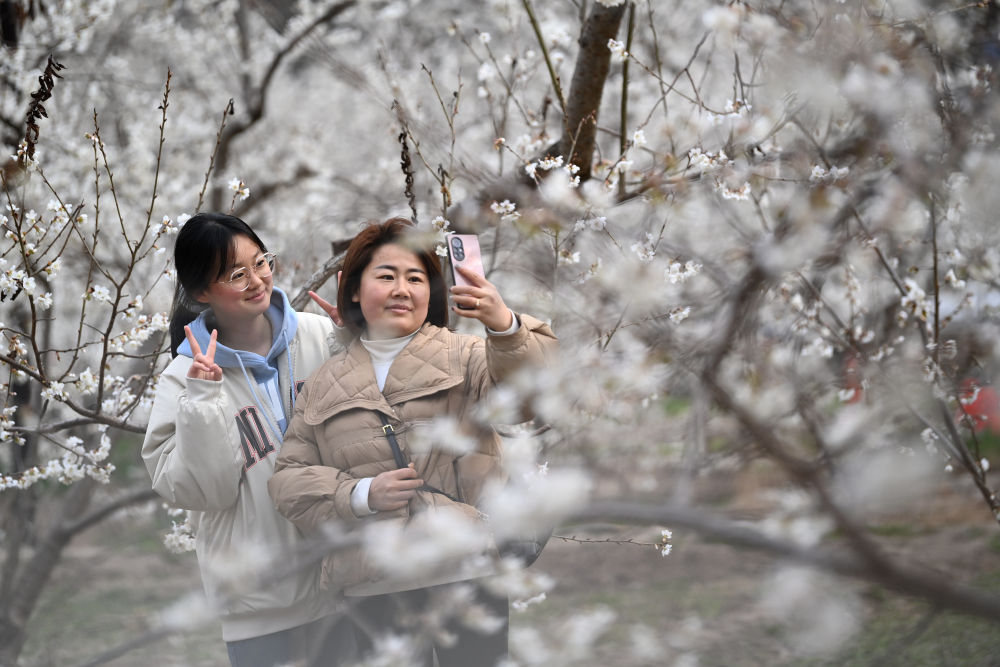 3月9日,兩名游客在隴南市武都區(qū)城關鎮(zhèn)石家莊村的櫻桃樹下拍照留念。新華社記者 陳斌 攝