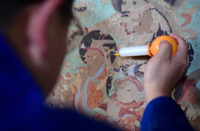 工作人員在修復(fù)出現(xiàn)病害的壁畫(huà)。記者 杜哲宇 攝