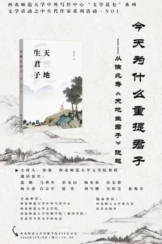 2024年10月12日,由西北師范大學(xué)中外寫作中心、西北師范大學(xué)文學(xué)院、西北師范大學(xué)傳媒學(xué)院、甘肅省當(dāng)代文學(xué)研究會(huì)聯(lián)合主辦的“文學(xué)昆侖”之中生代作家系列活動(dòng)“今天為什么重提君子——從徐兆壽《天地生君子》說(shuō)起” 徐兆壽《天地生君子》作品分享會(huì)在西北師范大學(xué)舉辦。