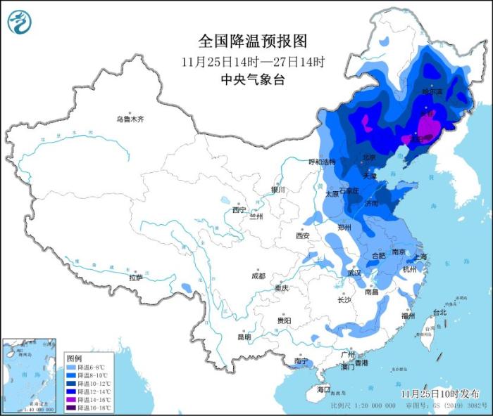 預計,11月25日14時至11月27日14時,內蒙古中東部、華北、東北地區(qū)中南部、黃淮、江淮、江漢東部、江南北部等地將先后降溫6~10℃,其中,內蒙古中部、華北北部、東北地區(qū)中南部等地部分地區(qū)降溫可達12℃以上。
