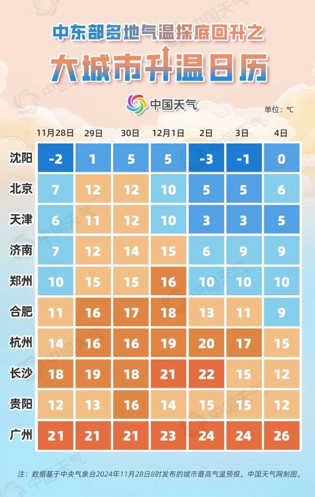 過去五天,今年下半年首場寒潮來勢洶洶,我國多地都度過了下半年來最冷的一天。隨著寒潮影響結(jié)束,中東部大部氣溫探底回升,今天(11月28日)起各地將陸續(xù)進(jìn)入升溫模式,長江中下游等地有望沖擊20℃。中國天氣網(wǎng)推出大城市升溫日歷,看你家何時上演冷暖逆轉(zhuǎn)。