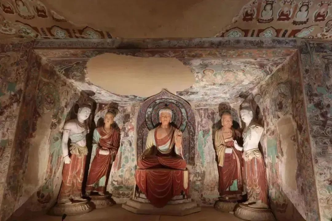 搬遷復原的洞窟內(nèi),不但保持了原來壁畫和塑像的原貌,洞窟內(nèi)的其他部位,如坍塌壁面也與洞窟原貌基本相同。從南湖店搬來的新建洞窟是磚混結(jié)構(gòu)的洞窟,我們對洞窟外墻面用礫石進行裝飾,這樣洞窟與周邊崖壁、洞窟相一致。這兩個洞窟被安置在莫高窟北區(qū)大沖溝中,既不破壞和影響原有洞窟,又使其與周邊崖面和洞窟融為一體。如果不被提醒,人們?nèi)菀渍`認為它們就是古代所建造的洞窟。