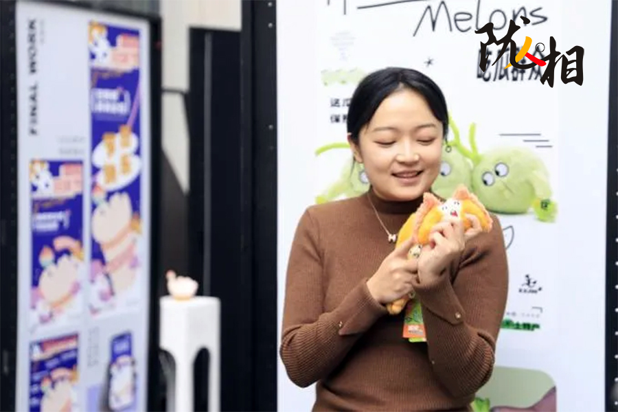 她拿起一只文創(chuàng)玩偶,輕輕拉起玩偶頂部蜷縮的細(xì)柄,這只紫紅色、毛茸茸的花椒玩偶立刻“嗡嗡”震動(dòng)起來(lái)?;ń肺队X(jué)上的麻就這樣傳遞到手上,精妙的構(gòu)思,令大家會(huì)心一笑。