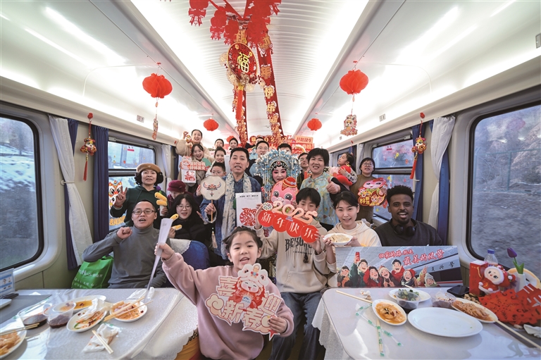 在歌聲、鼓聲、歡笑聲中,出鍋的餃子讓跨年列車的車廂年味更濃,把“春運回家”這一樸素而又濃烈的幸福感,通過舌尖味蕾傳遞,把“團圓便是年”“回家的路就是最美的風(fēng)景”,通過餃子這一代表著中國人情愫強烈的文化符號,將天南海北奔赴山海的人們團聚在列車、歡度在旅途。