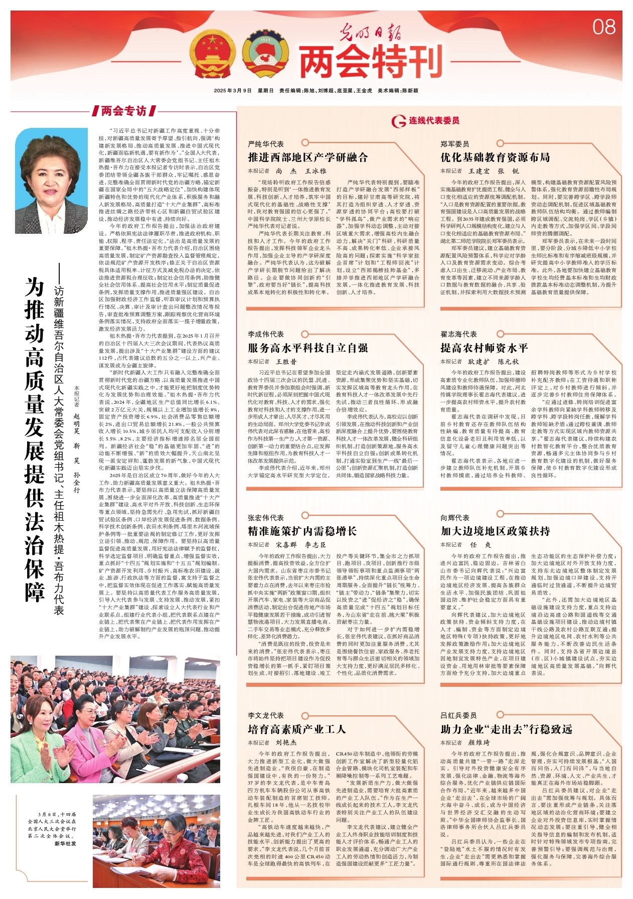 嚴(yán)純?nèi)A代表長期關(guān)注教育、科技和人才工作。今年的政府工作報告提出,發(fā)揮科技領(lǐng)軍企業(yè)龍頭作用,加強企業(yè)主導(dǎo)的產(chǎn)學(xué)研深度融合。嚴(yán)純?nèi)A代表認為,這為破解產(chǎn)學(xué)研長期脫節(jié)問題給出了解決路徑。企業(yè)要做協(xié)同創(chuàng)新的“引擎”,政府要當(dāng)好“鏈長”,提高科技成果本地轉(zhuǎn)化的積極性和轉(zhuǎn)化率。