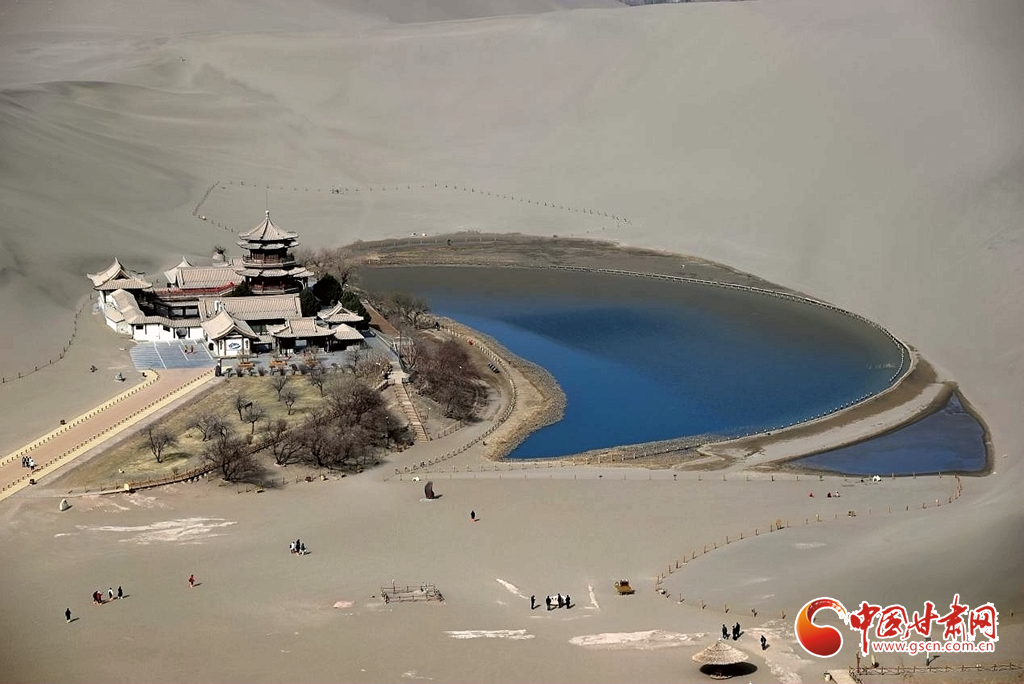 3月8日,隨著氣溫回暖,絲路明珠敦煌迎來(lái)早春勝景。鳴沙山環(huán)抱中的月牙泉冰雪消融,一泓碧水宛如翡翠鑲嵌在大漠之中,呈現(xiàn)出"沙水共生"的奇觀。