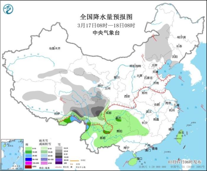 預(yù)計(jì)3月17日至23日,西藏東部、青海南部、川西高原、云南北部等地有小到中雪或雨夾雪,局地有大到暴雪;西藏東南部、四川盆地、貴州、云南中南部等地有小到中雨,局地有大雨。