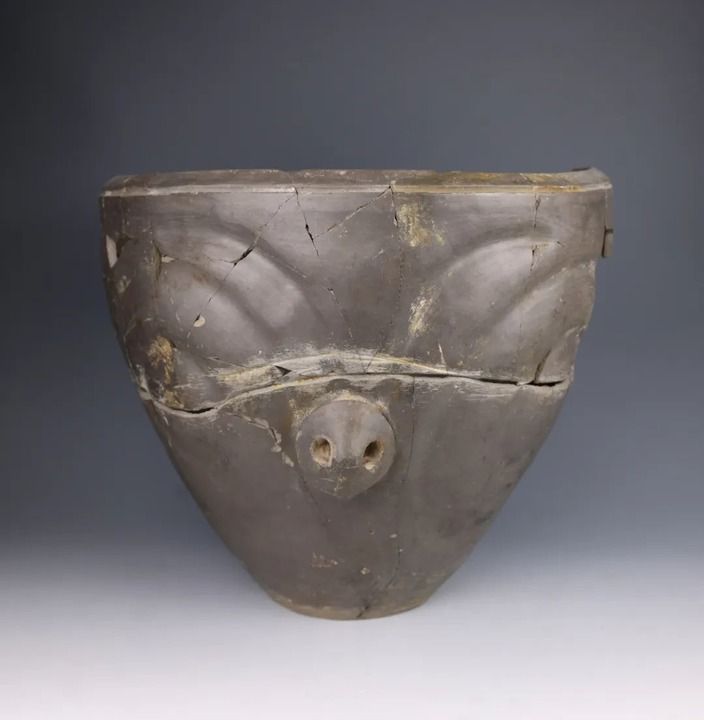 然而,馬家窯人的藝術(shù)創(chuàng)造力似乎遠(yuǎn)不止于此。寺洼遺址新出土的眾多陶器展現(xiàn)出全新的造型與紋飾風(fēng)格。如其中一件帶有“豬鼻”的馬家窯類(lèi)型泥質(zhì)灰陶,色澤深沉灰黑如夜,一只鼻子自陶胎中緩緩隆起,上方的弧形紋理像舒展的眉骨,又像張開(kāi)的羽翼,一場(chǎng)古文明的夢(mèng)境由此展開(kāi)。