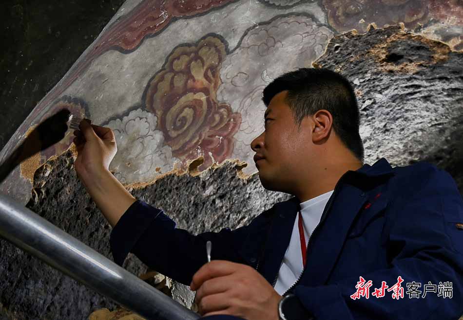 與窟外喧囂不同,在第30窟內(nèi),身著工裝的文物修復(fù)師緊握刀柄、輕刮泥土,讓壁畫和塑像重現(xiàn)昔日光彩。他們用巧手和匠心,靜靜地觸摸著“光陰的故事”。