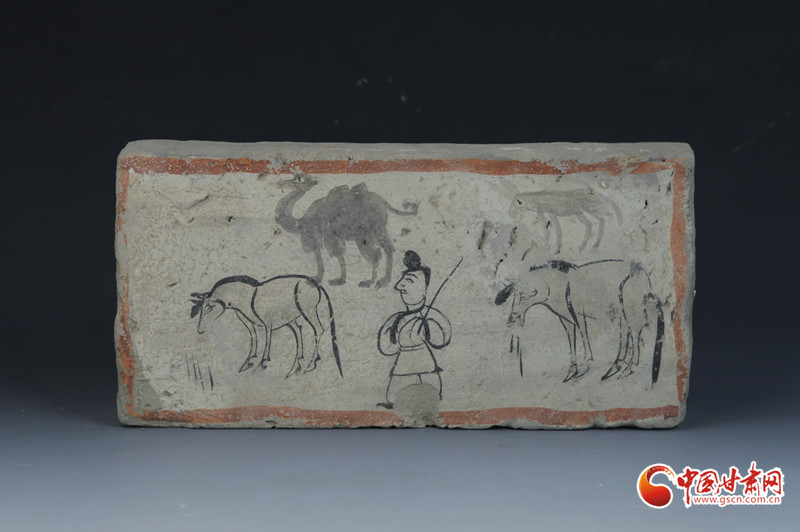 另一方面,它采用沒骨畫法,以彩色為墨,通過墨色濃淡來表現(xiàn)空間的遠(yuǎn)近。遠(yuǎn)處駱駝、毛驢的形象在墨色變化中層次分明,形成強烈的對比感。“此磚不僅是中國已知現(xiàn)存較早運用沒骨畫法的美術(shù)作品之一,而且這兩種繪畫手法并用在一塊壁畫磚上的情況,在中國美術(shù)史上也是較早的發(fā)現(xiàn),甚至比西方出現(xiàn)類似手法還要早。”孫麗娟介紹。