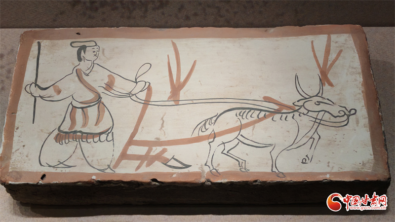 在博物館的“古冢丹青——高臺(tái)魏晉十六國時(shí)期墓葬壁畫藝術(shù)陳列”展廳里,記者看到,《二牛耕地畫像磚》生動(dòng)再現(xiàn)了當(dāng)時(shí)的農(nóng)耕技術(shù):兩頭耕牛架著直轅犁,后隨的男子一手扶犁一手揚(yáng)鞭,展現(xiàn)了典型的“二牛抬杠”耕作方式?!赌谅箞D壁畫磚》則描繪了古人放牧鹿群的獨(dú)特場景,為研究當(dāng)時(shí)的畜牧業(yè)發(fā)展提供了珍貴資料。