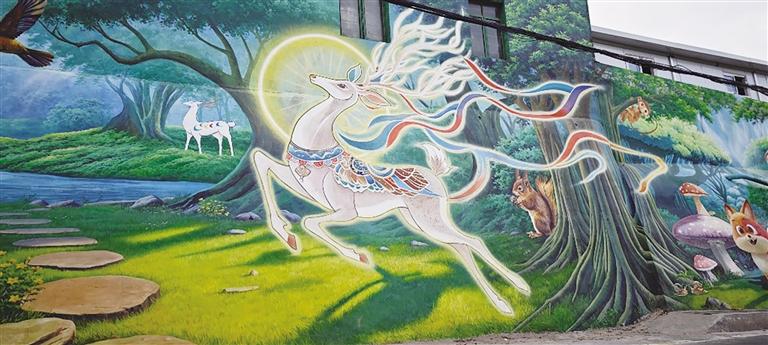 這些色彩斑斕的墻繪以城關(guān)區(qū)深厚的文化底蘊為底色,將民俗風(fēng)情、自然生態(tài)與城市記憶巧妙交織。在伏龍坪街道,一面巨幅“舞獅”墻繪氣勢恢宏,紅黃相間的獅子昂首騰躍;在山間步道旁,“九色鹿”悠然立于云霧之間,靈動雙眸映照山河,將敦煌文化的神秘與自然之美娓娓道來。