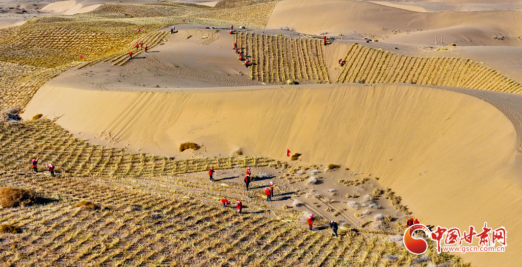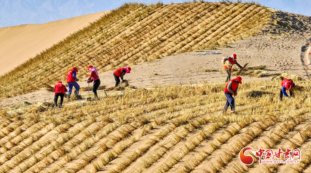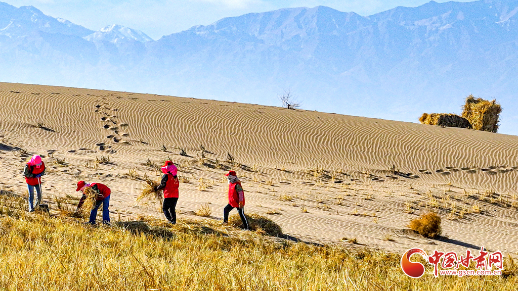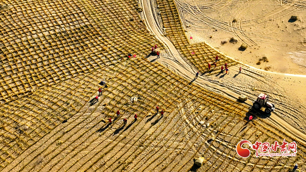 連日來,在張掖市肅南裕固族自治縣明花鄉(xiāng)西南部的干旱荒漠區(qū),運草車輛往復穿梭,1600余名治沙工人于巴丹吉林沙漠西南緣的沙丘間忙碌作業(yè)。他們劃線、背草、俯身鋪草、揮鍬壓埋,全力營建沙障與固沙林帶,為沙漠牢牢“鎖邊”。