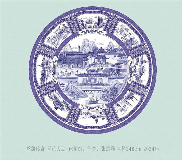 值得關注的是,展品中既有莫高窟第328窟復制彩塑這樣的經(jīng)典再現(xiàn),也有直徑達248厘米的“絲路傳奇·青花大盤”,呈現(xiàn)出多元文明共生的歷史圖景。瓷器作品是江西瓷藝大師歷時多年、多次赴敦煌采風創(chuàng)作的結晶,通過高溫顏色釉的窯變特性,將敦煌壁畫的斑駁肌理與礦物顏料的神秘色彩凝固定格,在釉色流淌間實現(xiàn)古典美學與現(xiàn)代工藝的完美融合。