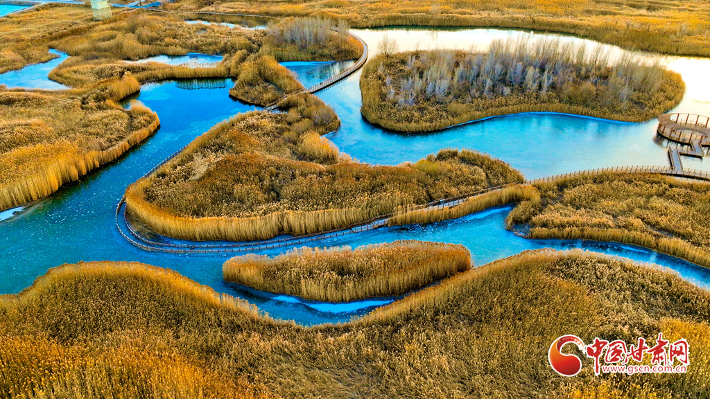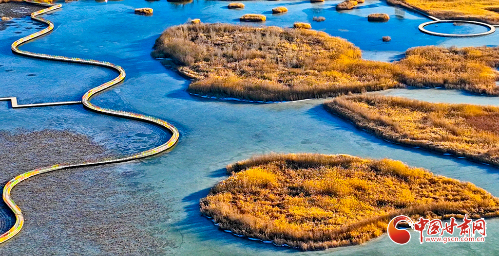 12月4日,張掖市黑河濕地國家級自然保護區(qū)內(nèi),經(jīng)風(fēng)霜浸染的蘆葦與蒲草披上金裝。從高空俯瞰,夕陽下的蘆葦蕩如金色海洋,蘆花隨風(fēng)輕舞,碧水凝冰環(huán)繞其間,宛如一幅鋪展的濕地金畫卷,吸引眾多游客與攝影愛好者前來觀賞拍攝。